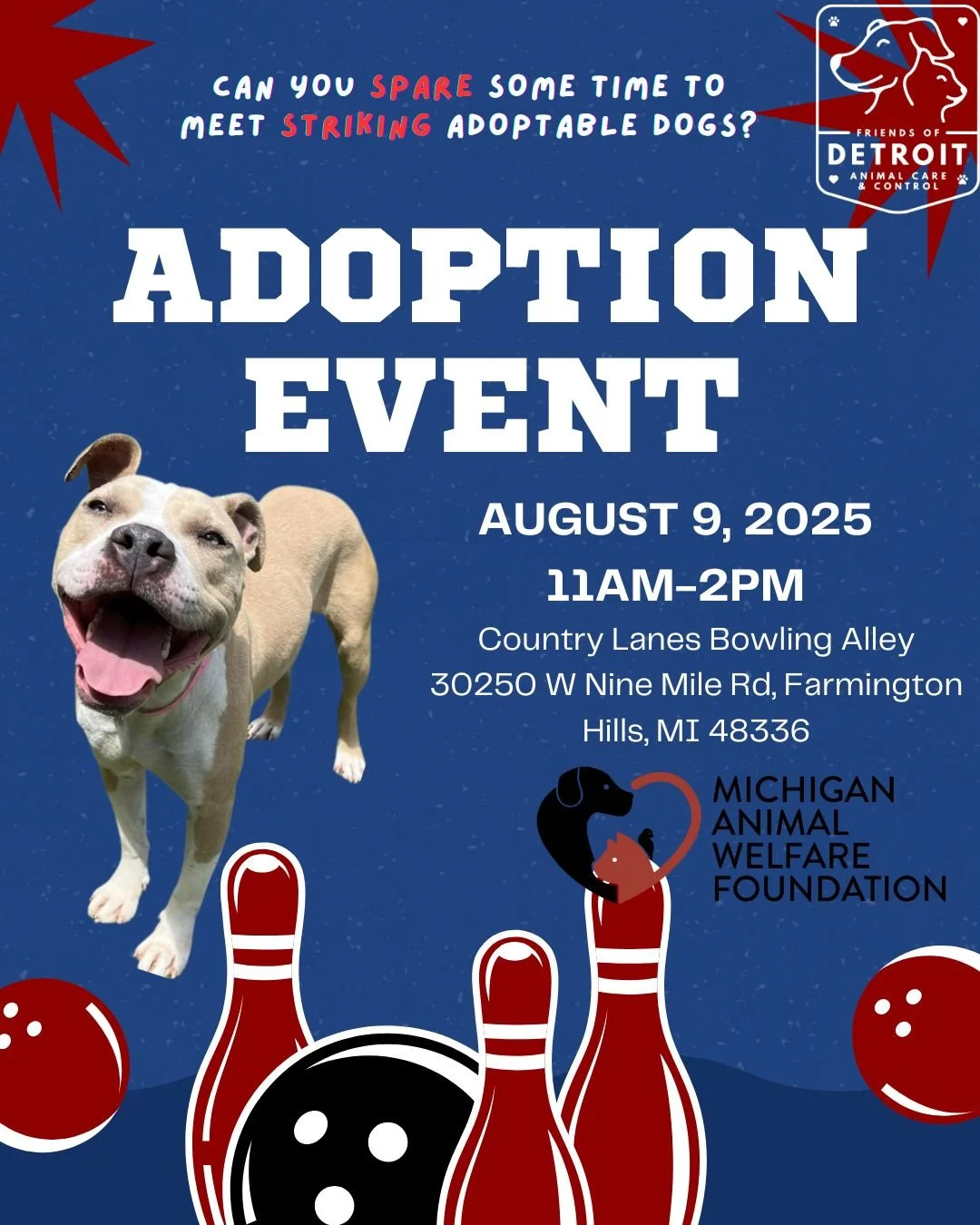 Looking for your perfect match? Come meet adoptable dogs from Detroit Animal Care and Control at this special event hosted at Country Lanes Bowling Alley in partnership with Michigan Animal Welfare Foundation.